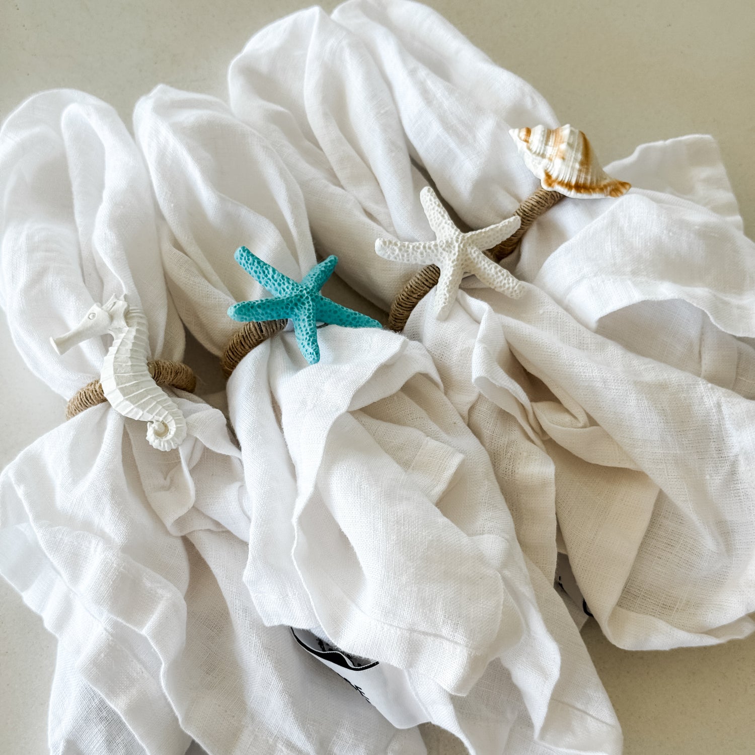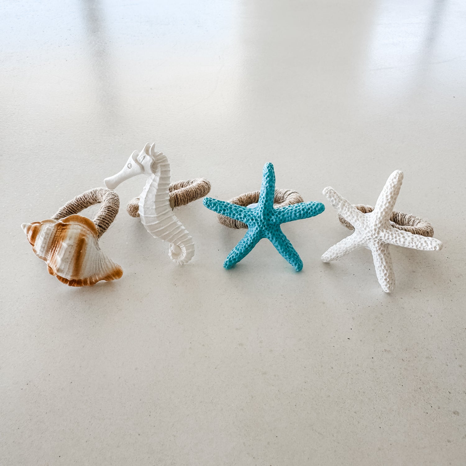 - Set of 4 assorted napkin rings (starfish, seahorse, shell, turquoise starfish)