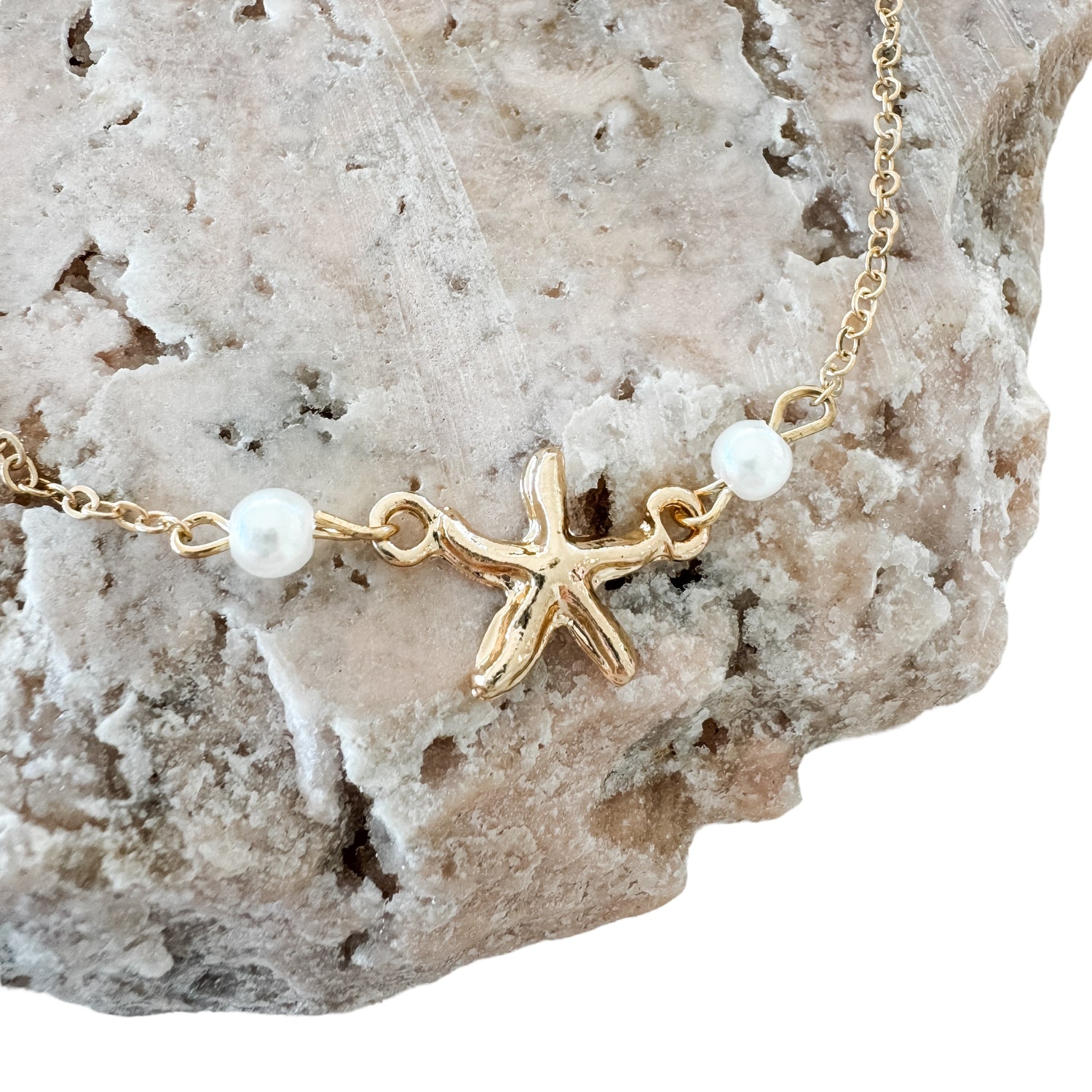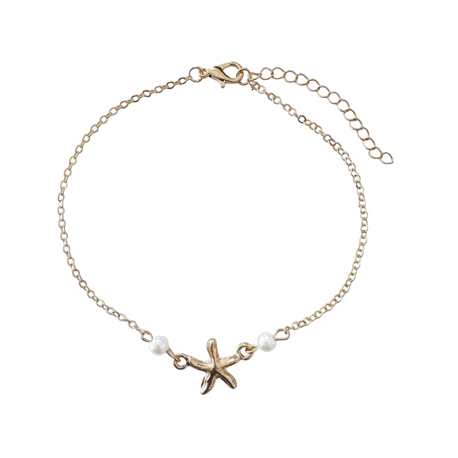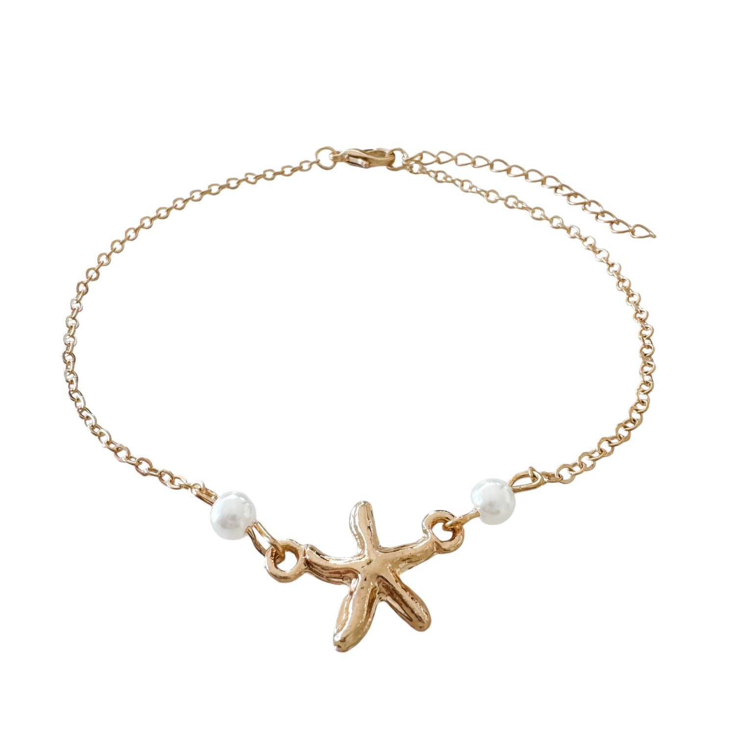 Introducing our elegant Gold Seastar Anklet, featuring a delicate gold chain adorned with a stunning gold starfish charm and two lustrous pearl beads. Adjustable in length for the perfect fit, this anklet adds a touch of coastal charm to any outfit, making it the ideal accessory for every occasion.