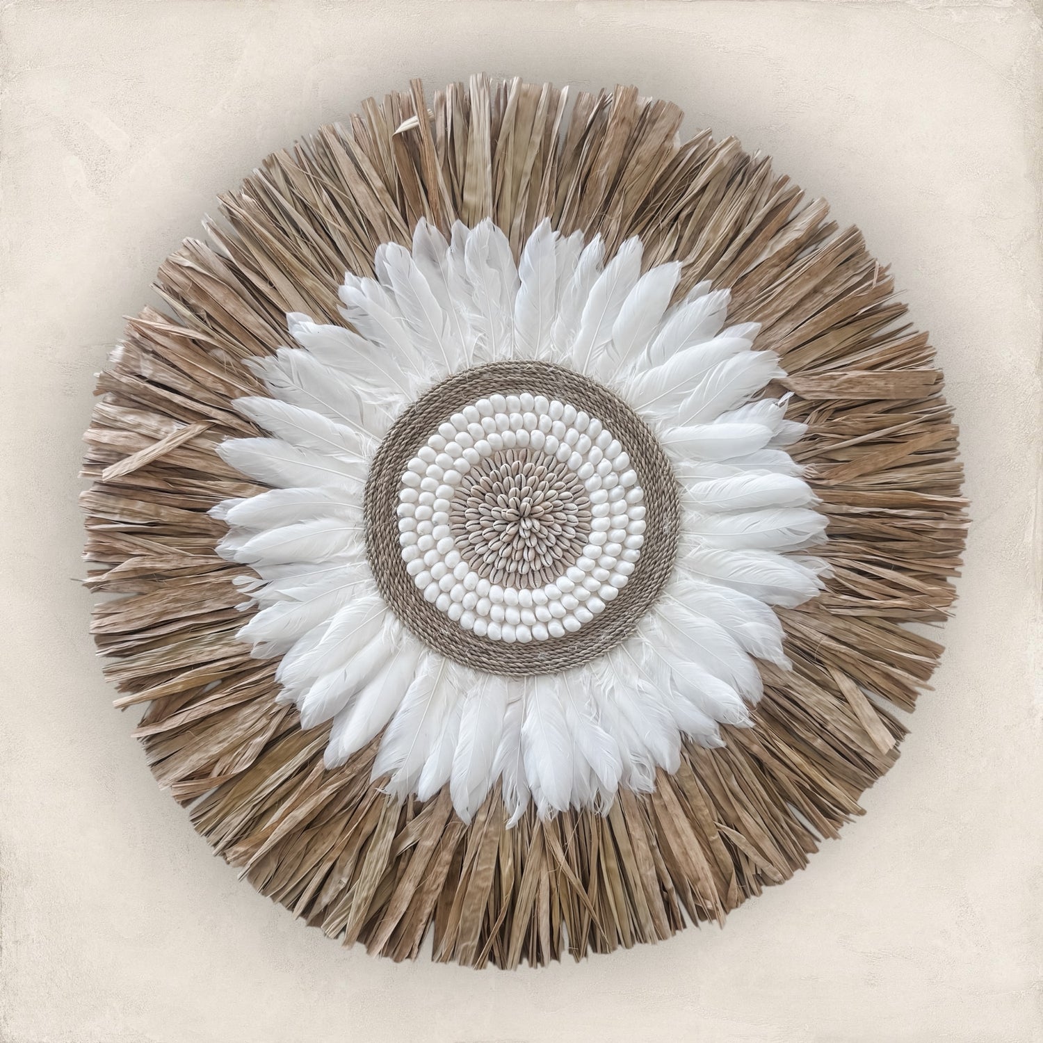Embrace earthy coastal style with the Natural & White Feather Juju Wall Hanging. Layers of raffia and white feathers frame a detailed shell centre, striking the perfect balance between natural warmth and beach-house elegance.