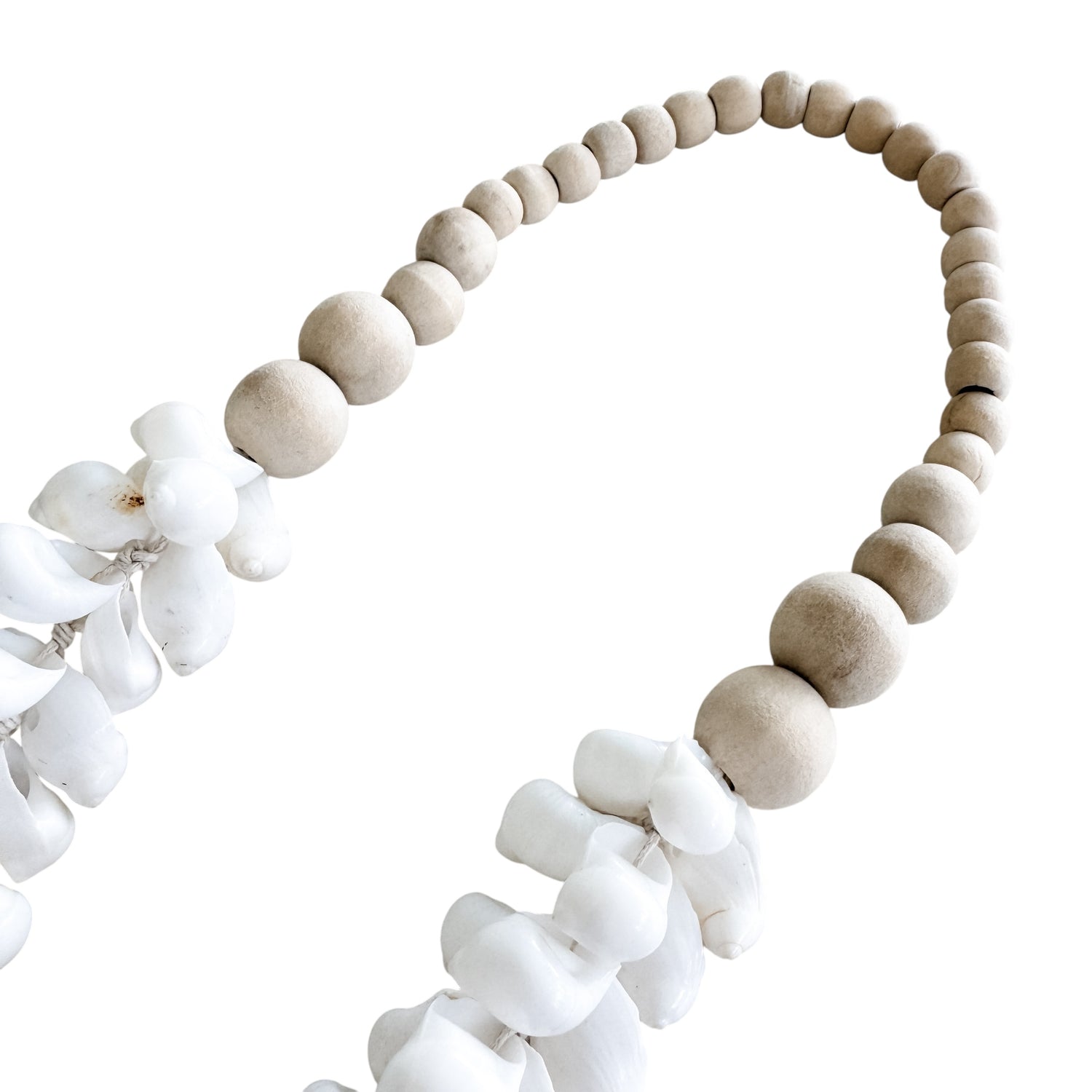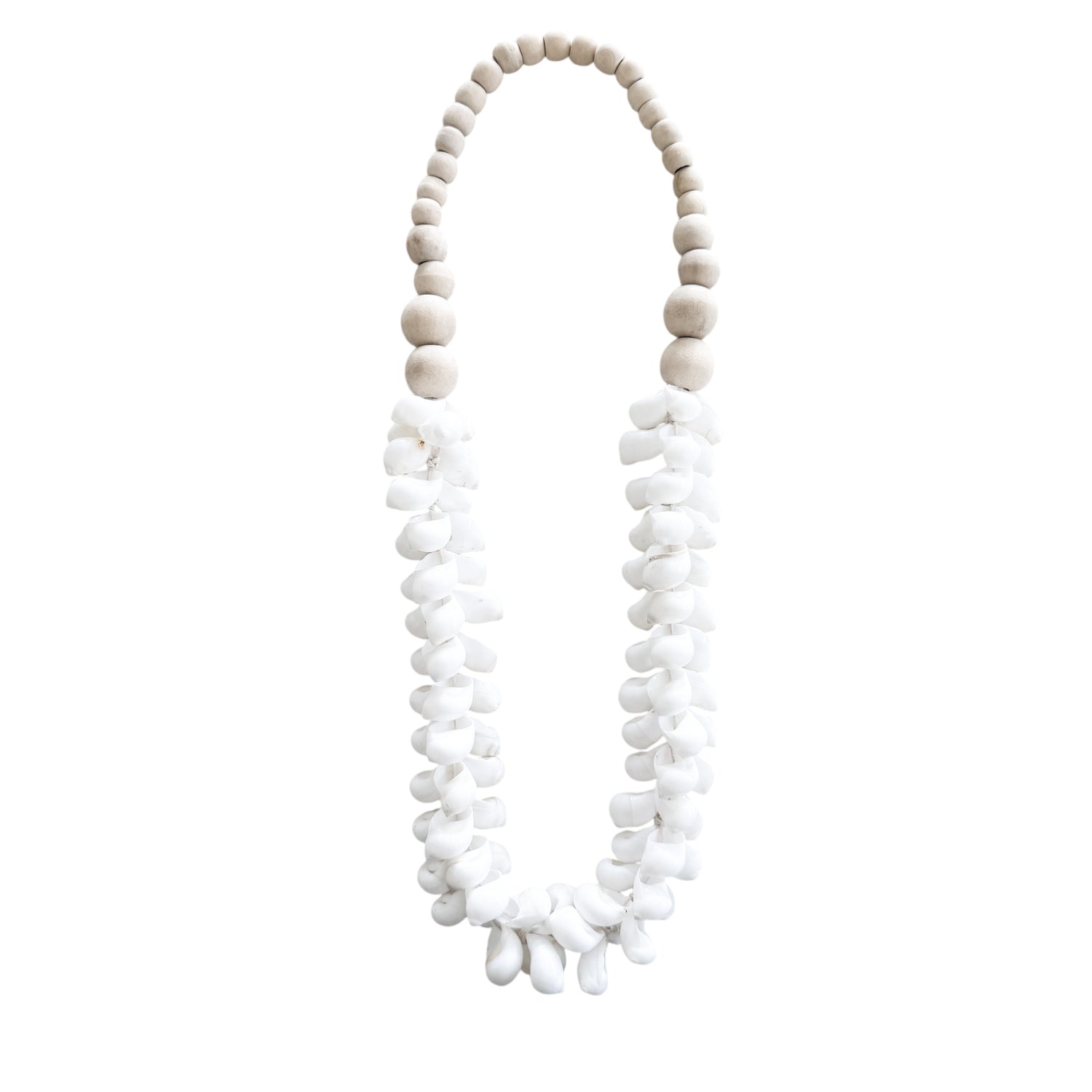 This handcrafted necklace combines natural wooden beads with glossy white shells for a fresh coastal feel. Beautifully versatile, it can be worn as a necklace or styled at home as a decorative hanging on hooks, walls, or stands. Its neutral tones make it easy to pair with any outfit or interior, adding a touch of organic elegance.