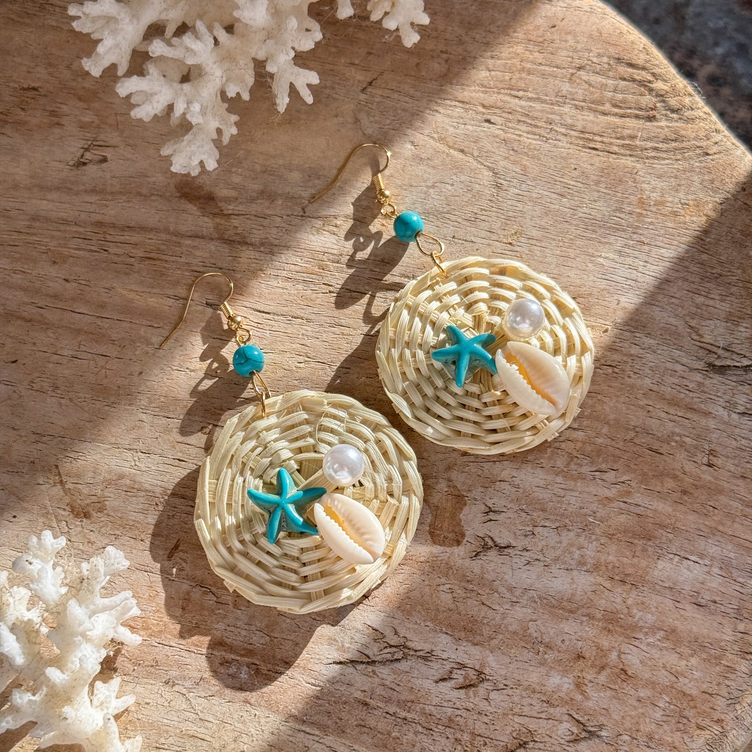 Bring the sea to your style with these coastal-chic earrings. Handwoven rattan discs (4.5cm wide) form the base for a dreamy ocean-inspired design, adorned with a turquoise starfish, a natural cowrie shell, and a lustrous pearl bead. Finished with a turquoise accent bead and gold-tone hooks, these earrings are lightweight yet full of character—perfect for summer days, beach escapes, or adding a touch of island charm to any outfit.