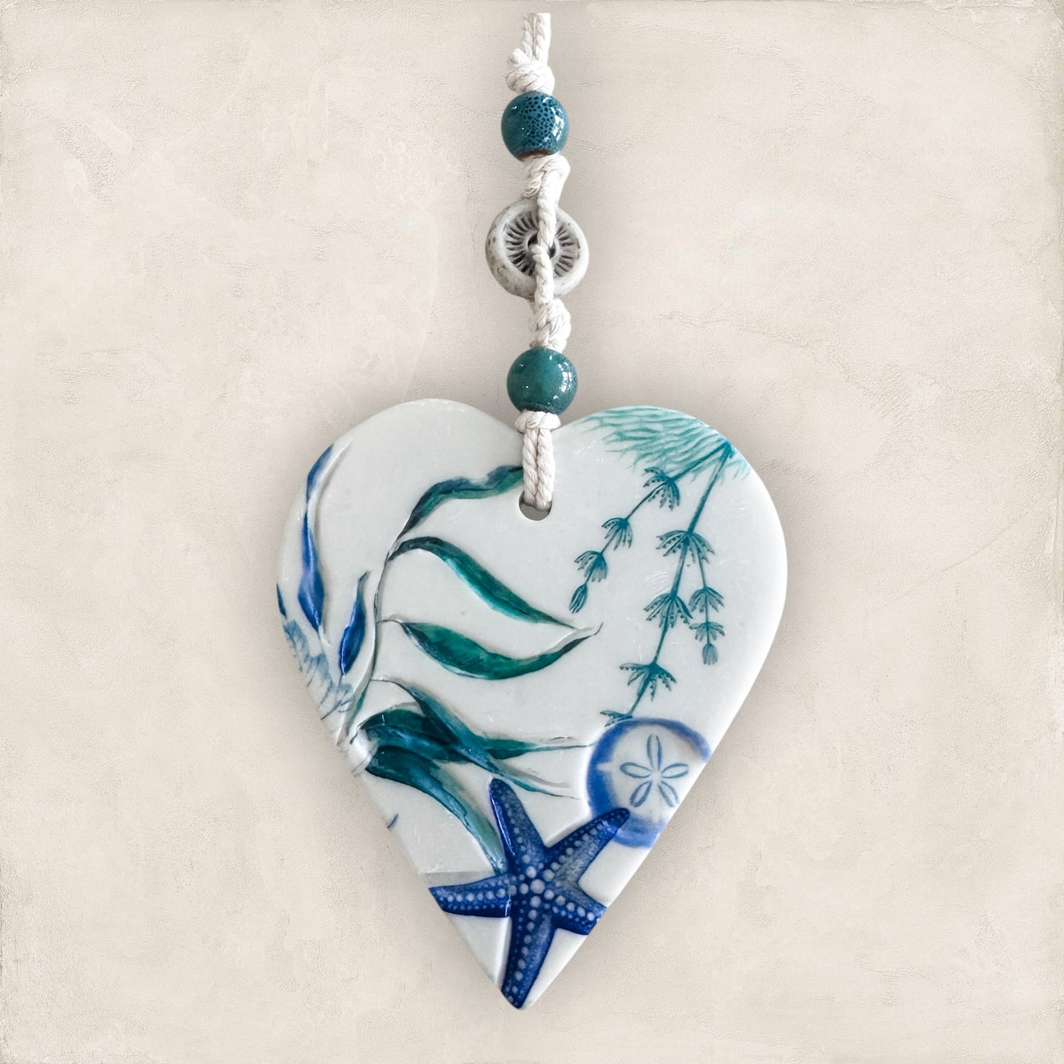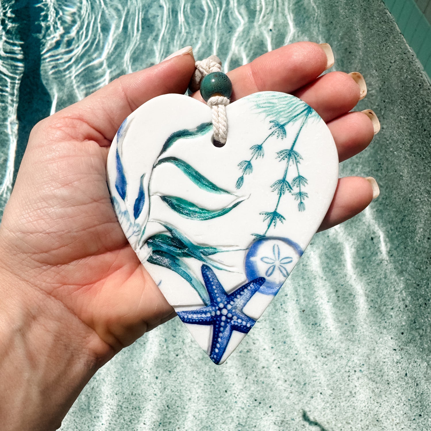 - Resin heart plaque with starfish, sand dollar, and seaweed details