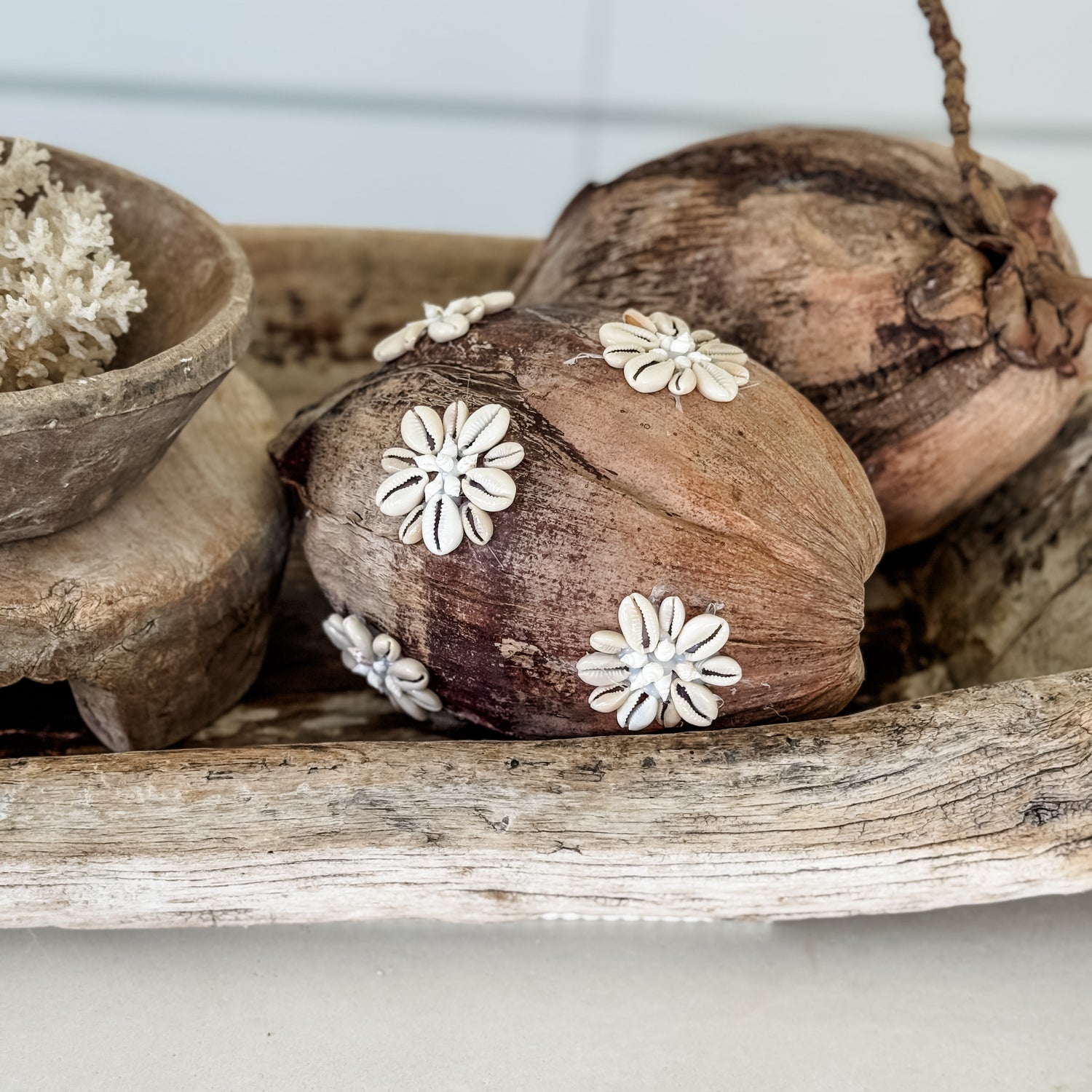 Bring an effortless island touch into your home with our Shell-Kissed Decorative Coconuts. Each natural coconut is adorned by hand with delicate cowrie-shell floral motifs, creating a beautiful fusion of raw coastal texture and artisan detail.