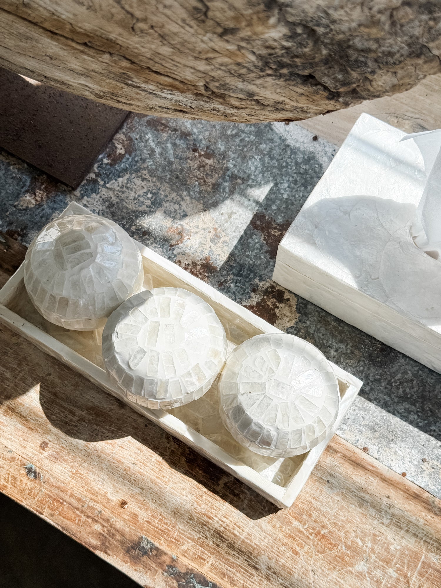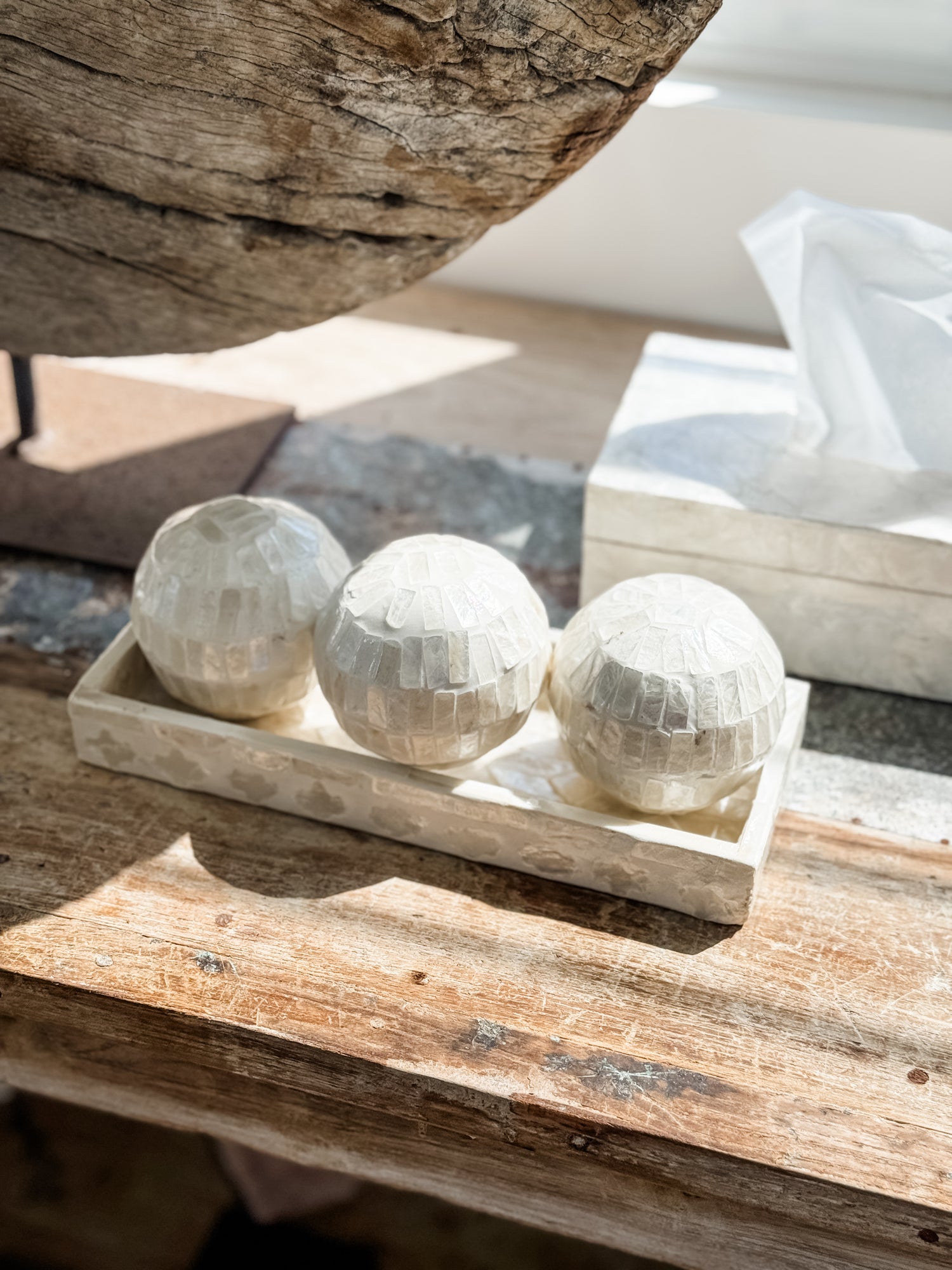 Each piece is hand-crafted with luminous shell inlay, creating a gentle shimmer that catches the light beautifully. Its soft ivory tone and organic mosaic pattern make it a timeless accent for coffee tables, shelves, or bathroom trays.