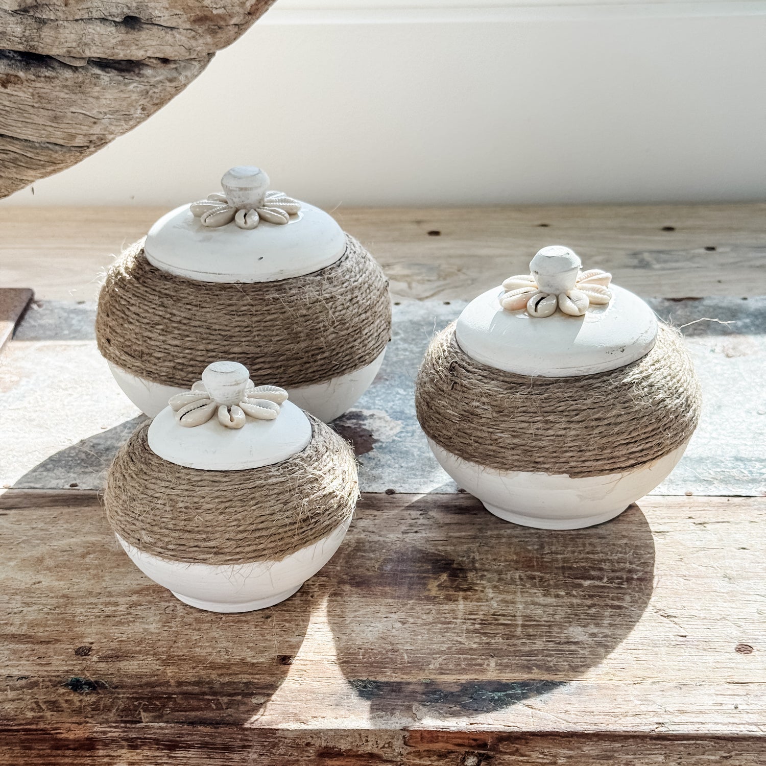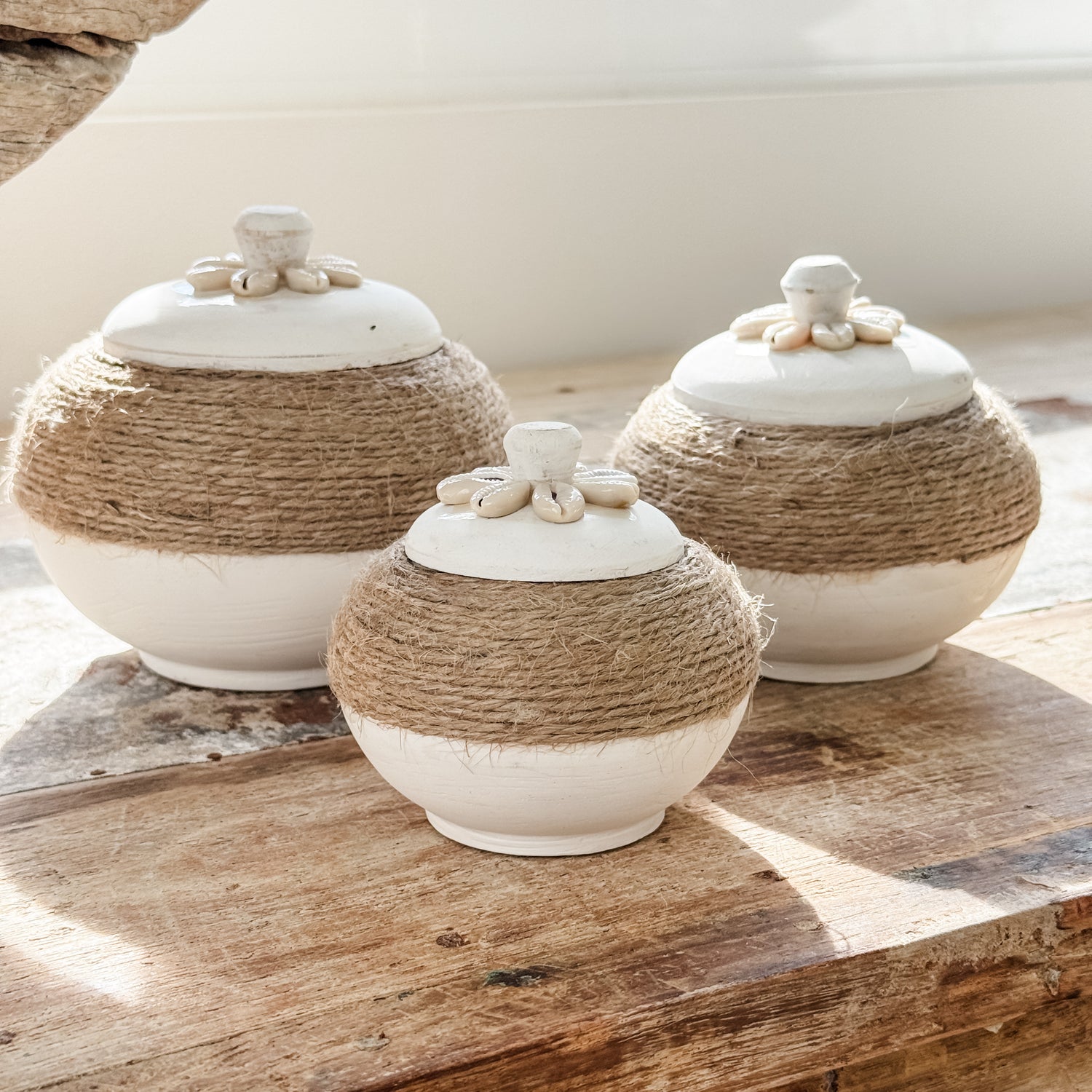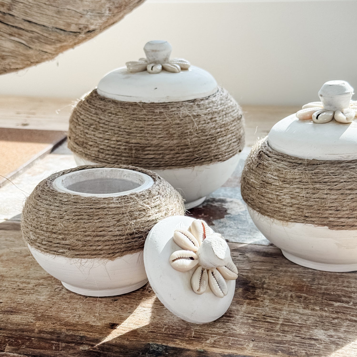 Handcrafted with a beautiful blend of natural textures, our Tideshell Lidded Pots bring effortless coastal charm to any space. Each pot is shaped by hand, finished in a smooth white paintwash, and wrapped in natural jute for a raw, earthy feel. The lid is adorned with a ring of hand-placed cowrie shells, creating the sweetest little statement detail.