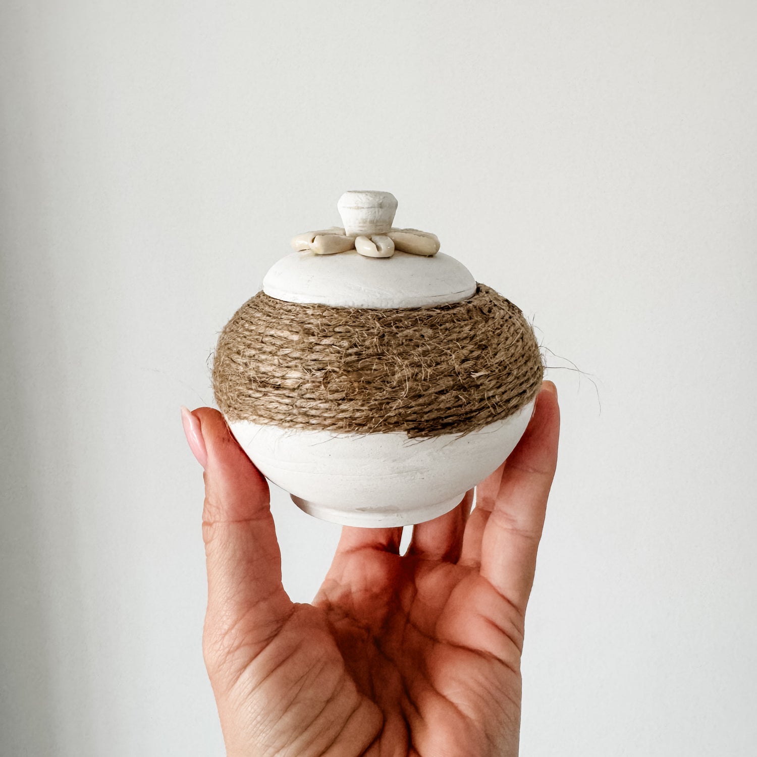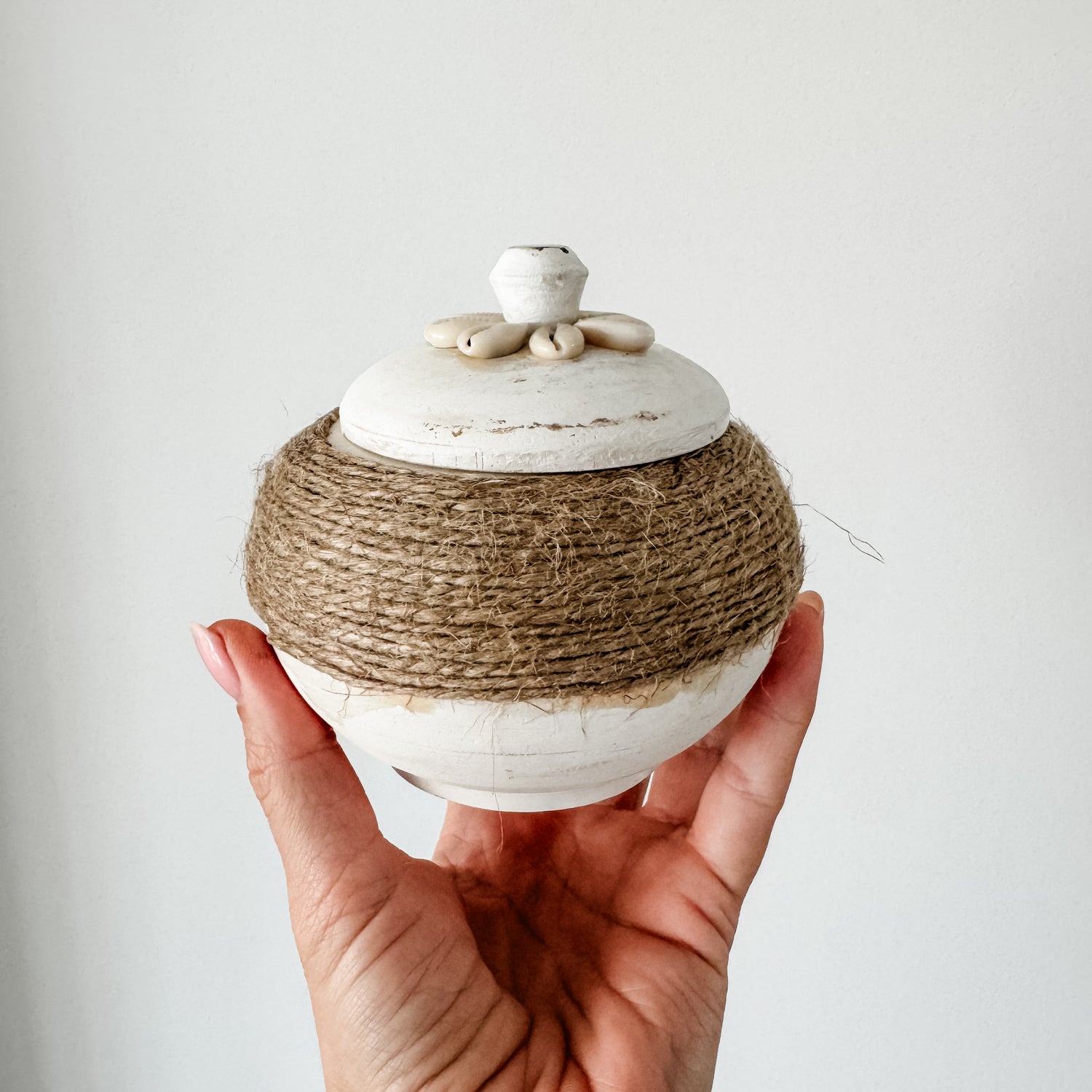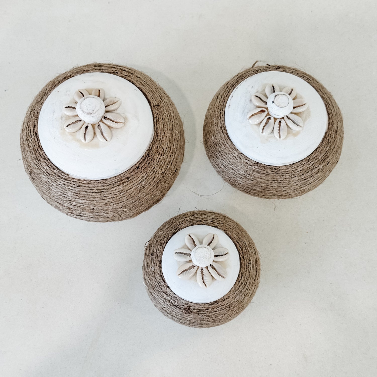 Handcrafted with a beautiful blend of natural textures, our Tideshell Lidded Pots bring effortless coastal charm to any space. Each pot is shaped by hand, finished in a smooth white paintwash, and wrapped in natural jute for a raw, earthy feel. The lid is adorned with a ring of hand-placed cowrie shells, creating the sweetest little statement detail.