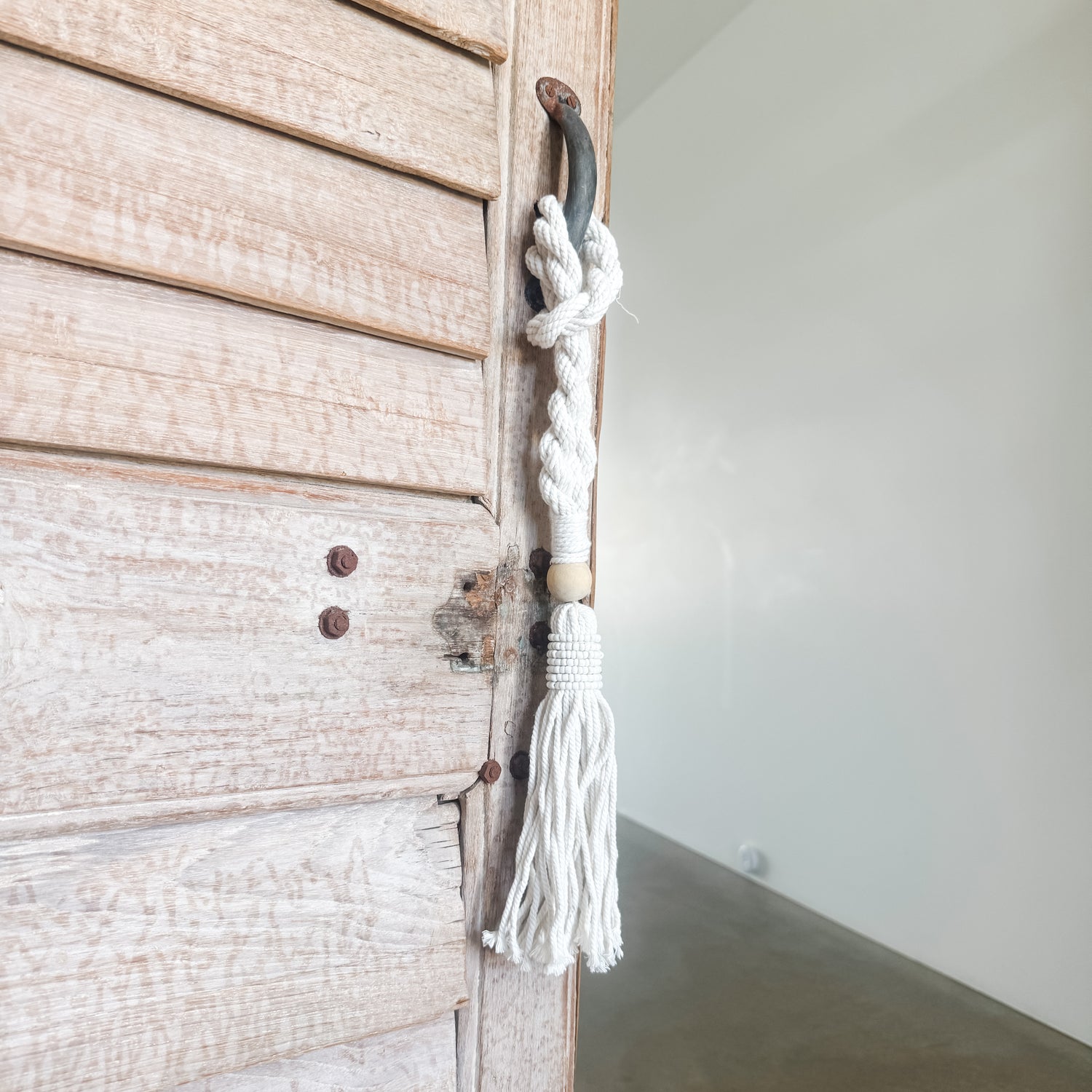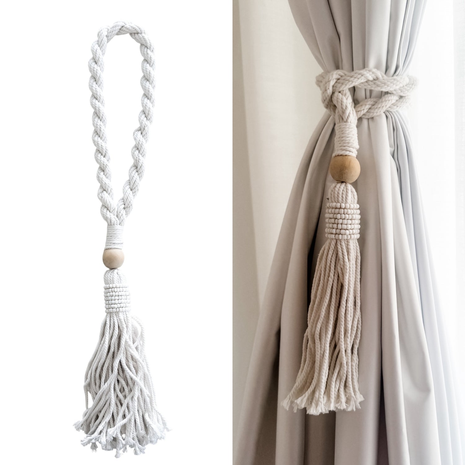 Handmade from natural cotton rope, this decorative tassel adds a stylish boho touch to any space. Featuring a chunky braided loop, natural wooden bead, and long cotton tassel with white beaded detail, it can be used as a curtain tieback, wall accent, or decorative hanging on doors, hooks, or furniture. A versatile piece that blends coastal charm with modern minimalism.